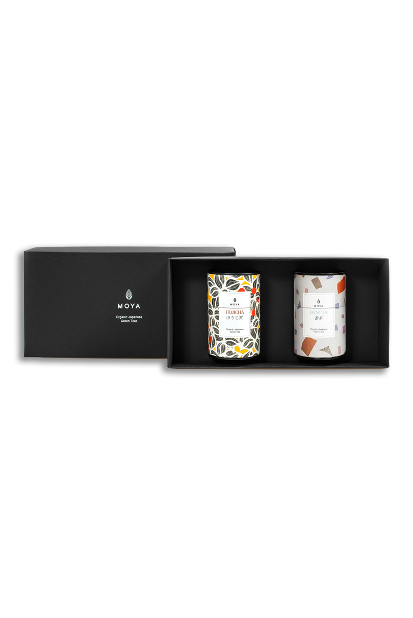 Moya organic Hojicha & Bancha set in an elegant black paper box