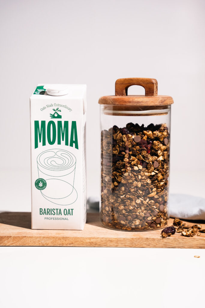 - Gdy granola całkowicie wystygnie i stanie się chrupka, dodaj suszoną żurawinę oraz kawałki czekolady. Serwuj z ulubionymi owocami i napojem roślinnym MOMA. Na zimno lub na ciepło.
