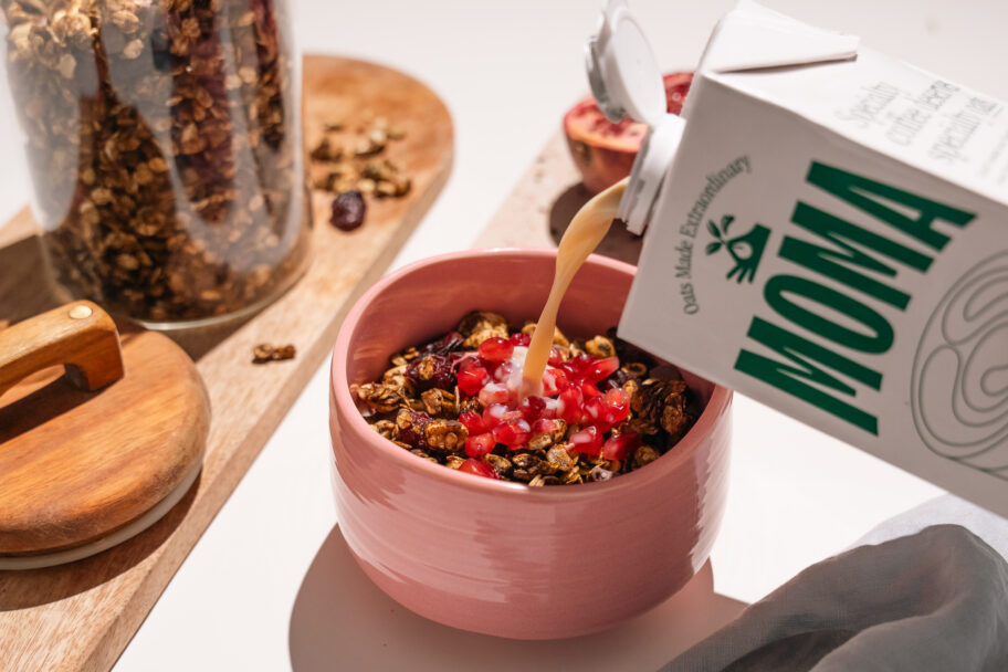 - Gdy granola całkowicie wystygnie i stanie się chrupka, dodaj suszoną żurawinę oraz kawałki czekolady. Serwuj z ulubionymi owocami i napojem roślinnym MOMA. Na zimno lub na ciepło.