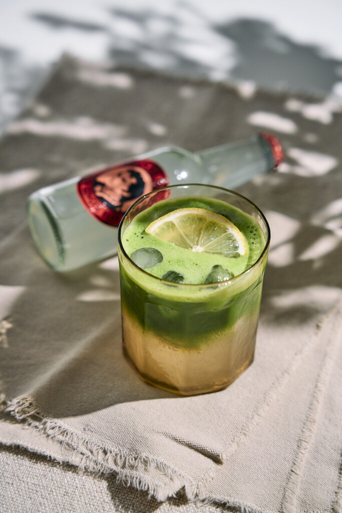 Elegancki, warstwowy wygląd sprawia, że Matcha Ginger Tonic świetnie prezentuje się w szklance, a delikatna goryczka matchy idealnie łączy się z pikantną świeżością imbiru Thomas Henry Spicy Ginger Beer.