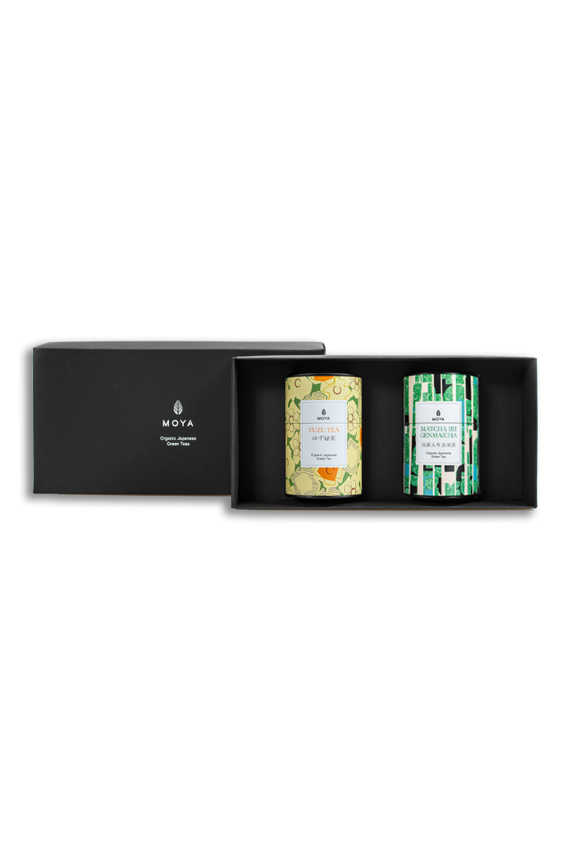 Podwójny zestaw z zieloną herbatą liściastą Yuzu Tea i Matchą Iri Genmaichą, zapakowany w eleganckie pudełko z logo Moya